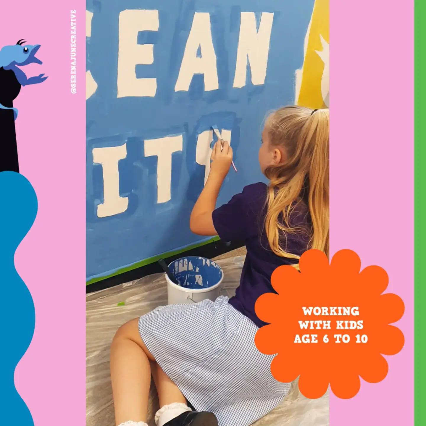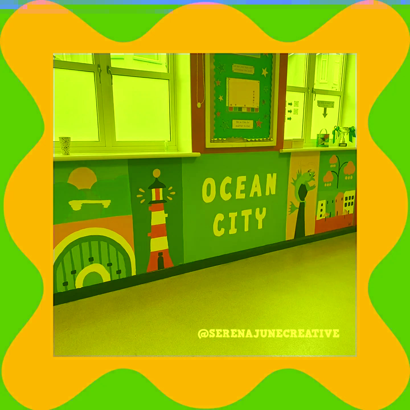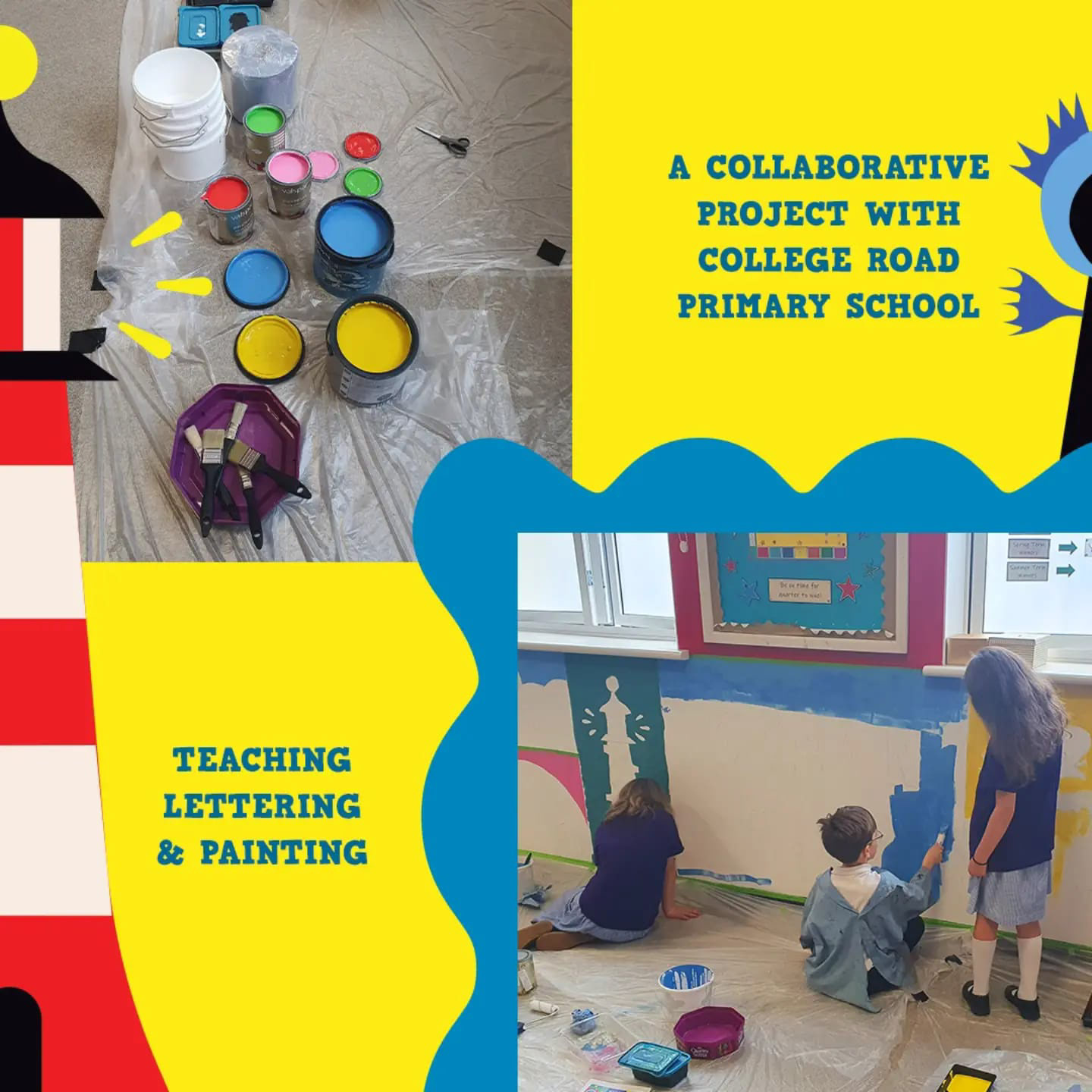I was invited into College Road Primary School to bring to life a mural that their children had drawn as part of their Arts Week. Together we painted a vibrant mural in their hall based on all the things they love about Plymouth.